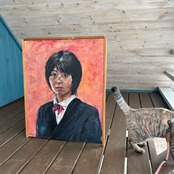 ◆人生で3作目の油絵。恩師からおつゆがきを教わり実践しました。背景部分です。薄くといた赤絵の具を多めに垂らし、布で拭き取るように描く技法です。肌の色が緑など混ざり綺麗で迫力があり、今見ても自分で自分にはっとさせられます。