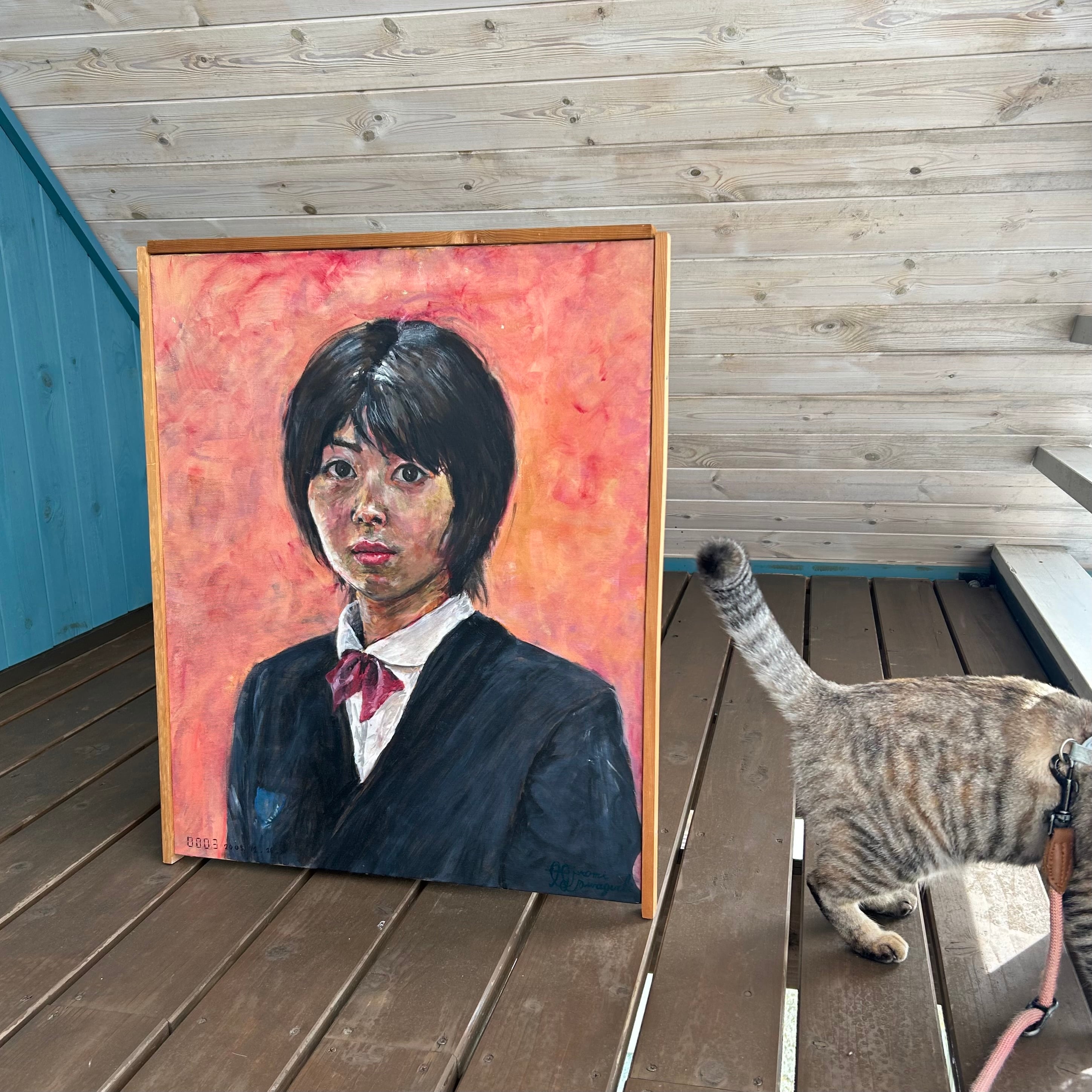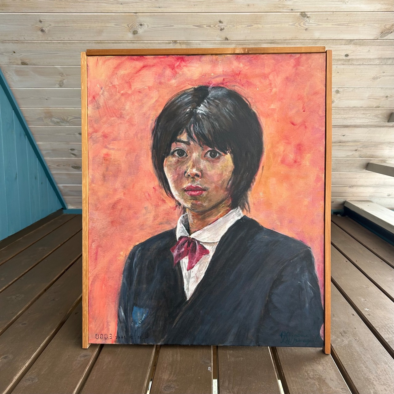 ◆この作品は、窓一枚分のサイズ感。赤の鮮やかさが空間に活気をもたらし、見る人に強い印象を残します。当時、中学校の1階で展示するにあたり先生が額をつけてくれました。板の簡易なものですが、嬉しかったのを覚えています。